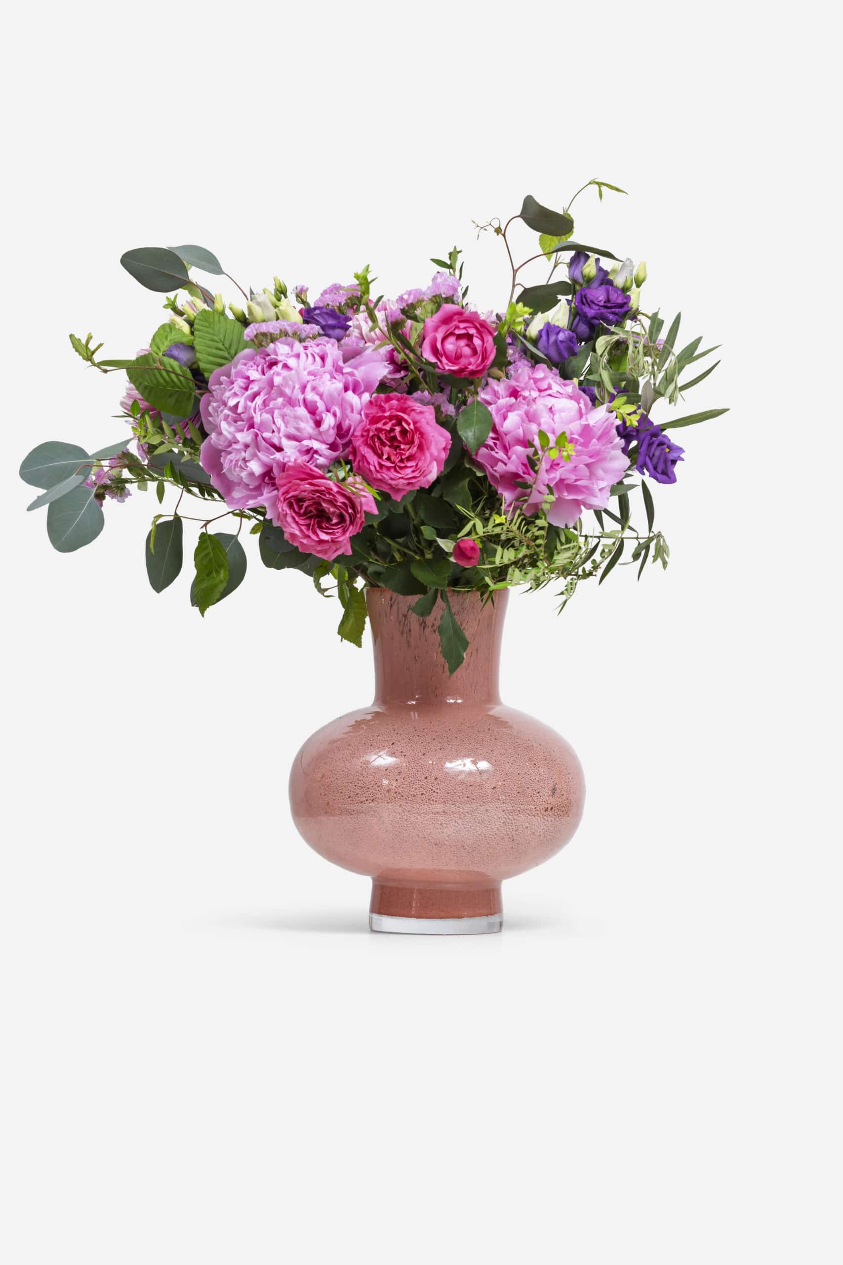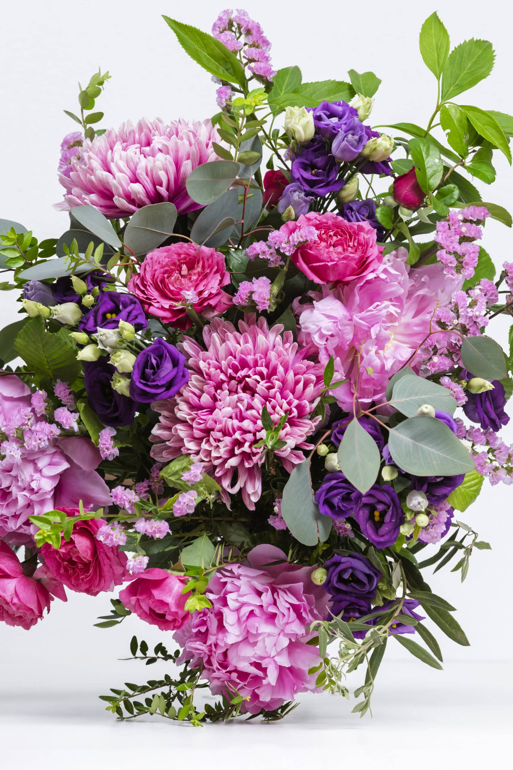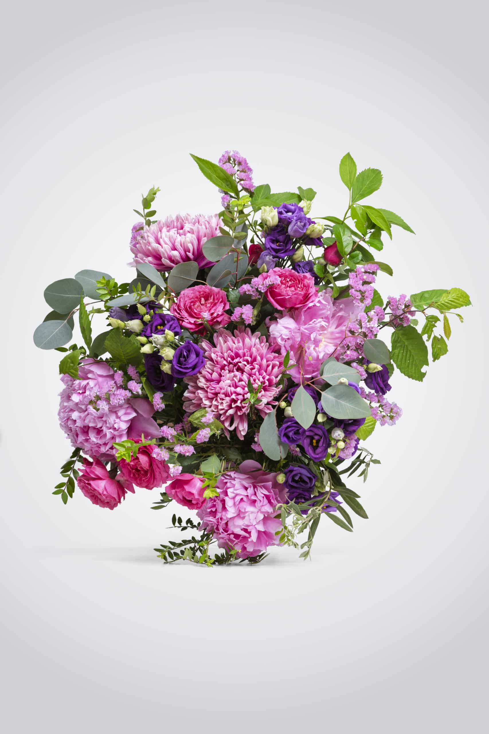 Le bouquet rose et violet offre une composition douce et harmonieuse! Un mélange de fleurs de saison de roses et de pivoines pour une fête des mères en douceur.