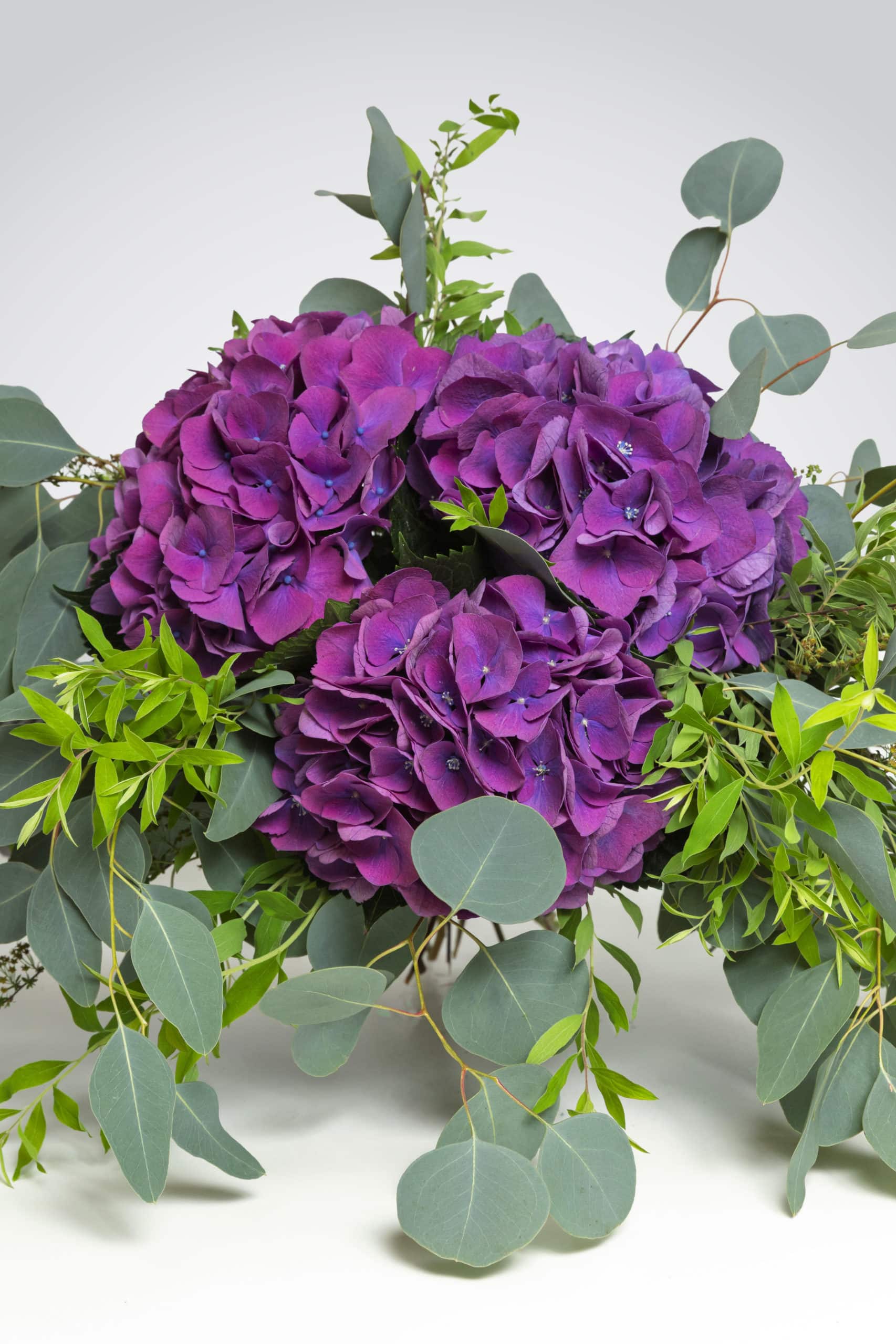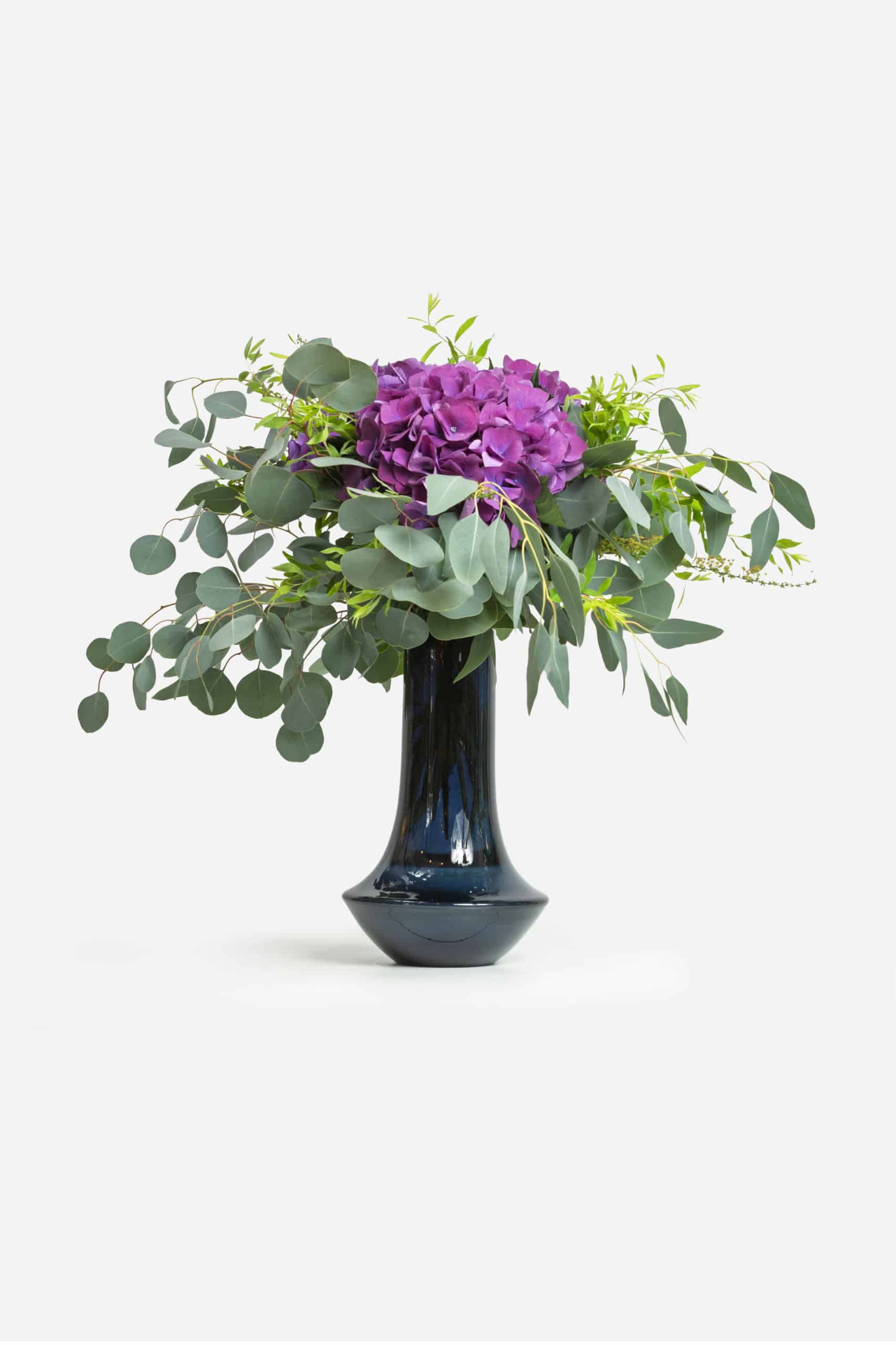 Les hortensias sont toujours spectaculaires, un bouquet sobre arrangé avec de l’eucalyptus, qui trouvera sa place dans un vase avec beaucoup d’eau.